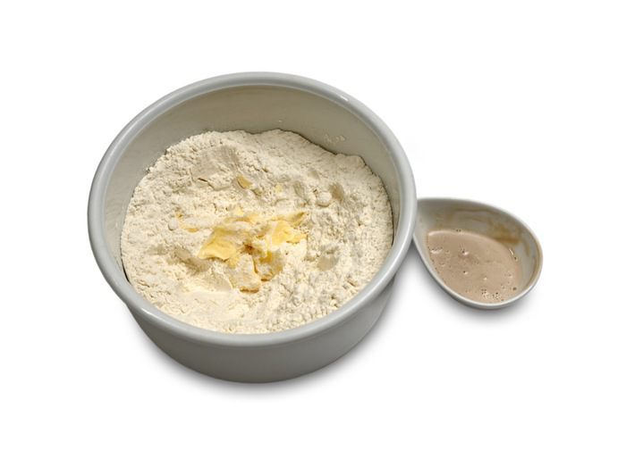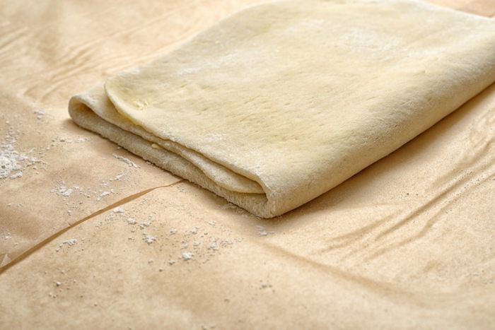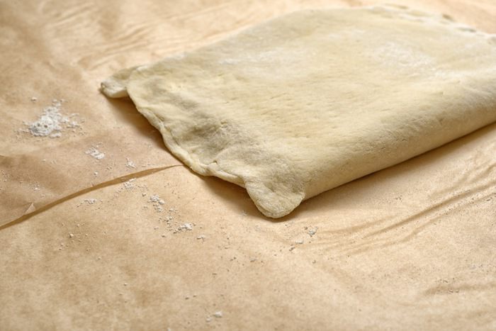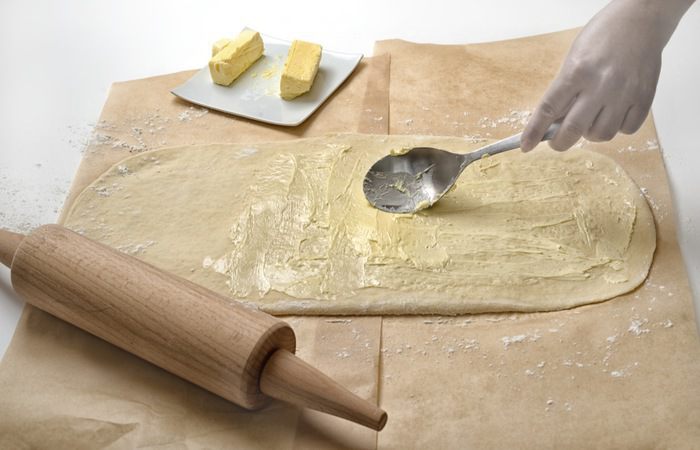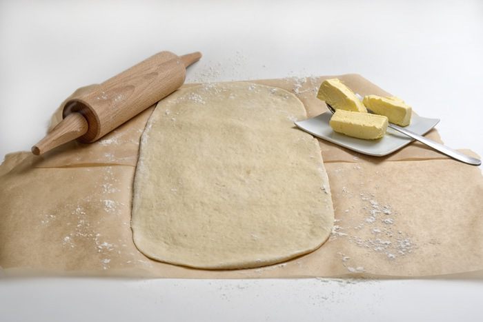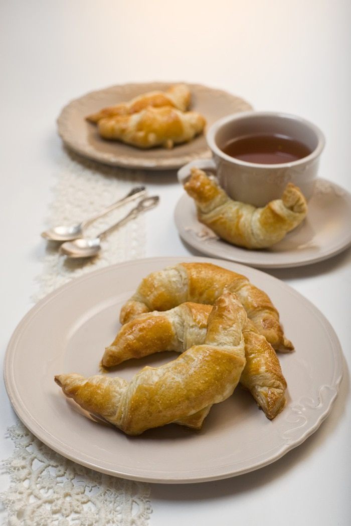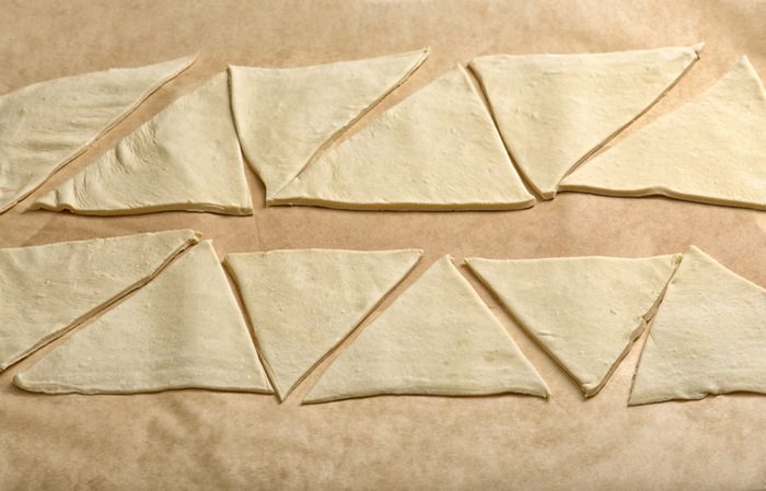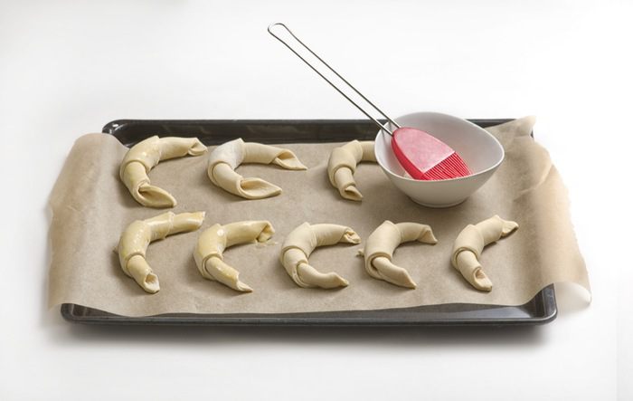 Из получившихся треугольников свернуть круассаны, придать им форму полумесяца и выложить на противень, предварительно застеленный бумагой для запекания, захлестами вниз. Расстояние между круассанами оставить минимум 5 см. Смазать круассаны взбитым яйцом и оставить на 40 минут для поднятия. Выпекать круассаны около 20 минут при температуре 180-200°C.