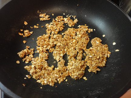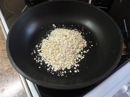 Две столовые ложки овсяных хлопьев выложить на сухую сковороду и подсушить в течение 1 минуты.