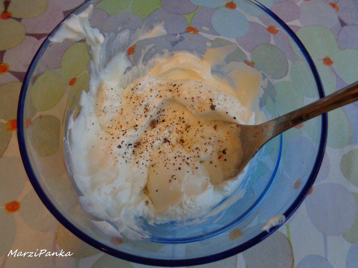 Добавить соль и свежемолотый перец (у меня микс) по вкусу. Перемешать.