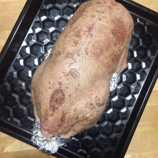Пока фаршируем гуся начинкой, разогреваем духовку до 220°С. Гуся зашиваем или закрепляем край зубочистками (кому как удобнее). Концы ножек и крыльев обернуть фольгой, обязательно ножки перевязать бечевкой. Гуся натереть солью и перцем, а затем положить на смазанный жиром или маслом противень. Запекать 30-35 минут, после чего снизить температуру духовки до 180°С и готовить еще 2,5-3 часа, периодически поливая гуся его соком.
