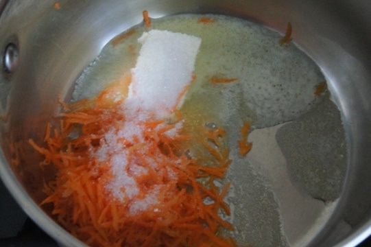 В кастрюльке разогреть сливочное масло, добавить тертую на мелкой терке морковь (небольшого размера) и сахар. Тушить 3-5 минут, помешивая.