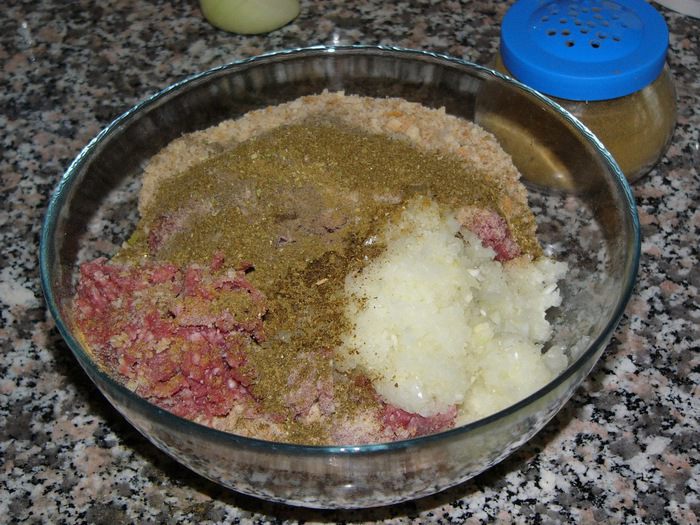 Добавить к фаршу лук, чеснок, молотые хлебные сухари, специи (у меня черный перец, кумин, молотый лавровый лист, тимьян, сухая мята) и соль.