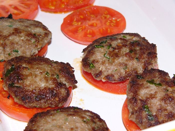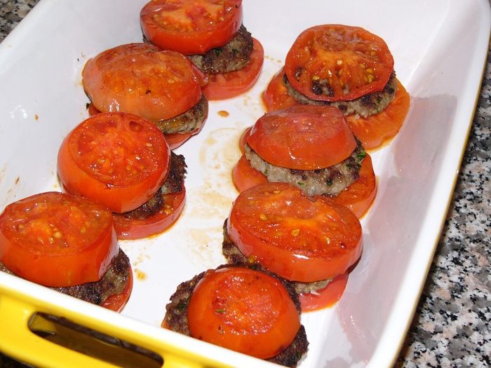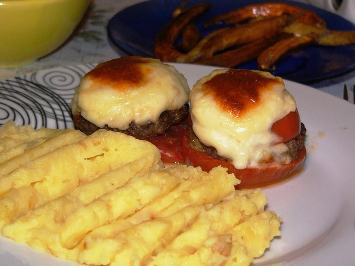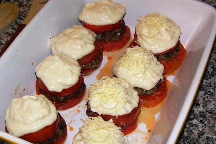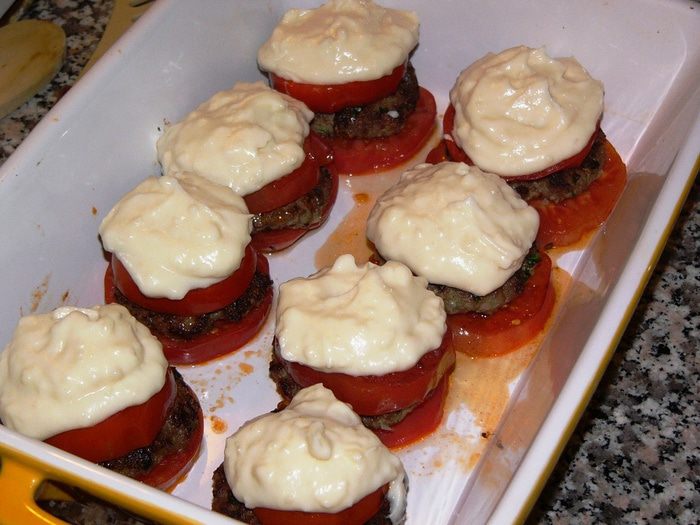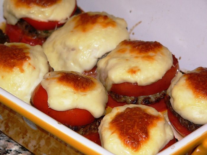 Котлеты, запеченные в помидорах, под соусом бешамель