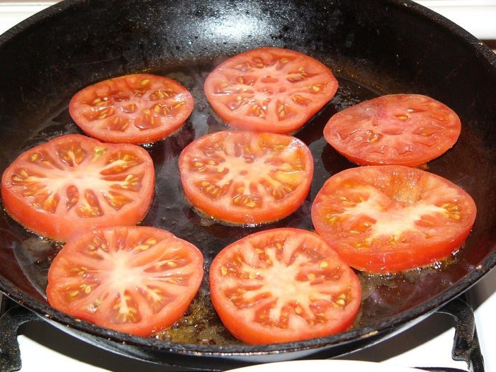 Помидоры вымойте и нарежьте толстыми кружочками. Быстро обжарьте на масле на другой сковороде с двух сторон, немного присаливая.