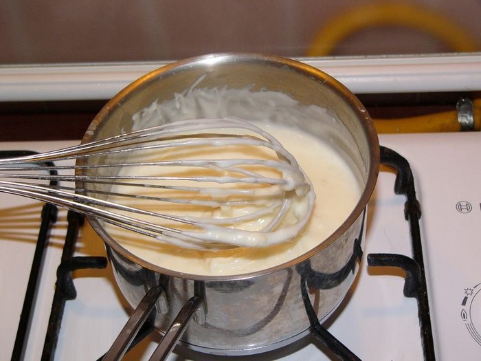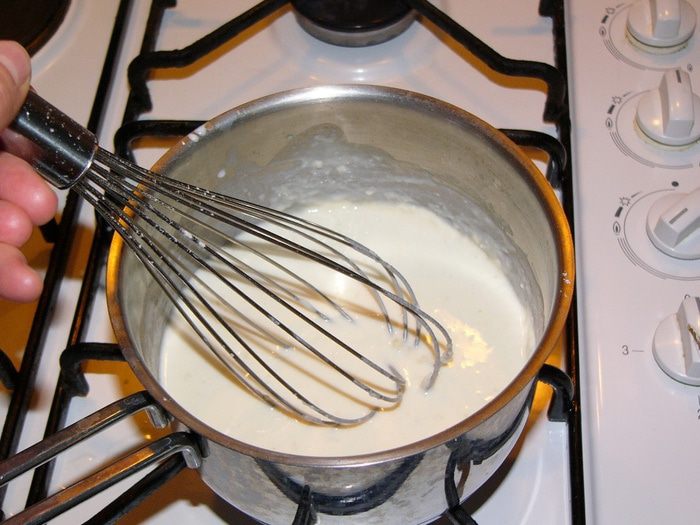 Постепенно вливайте в кастрюлю молоко, непрерывно помешивая венчиком.
