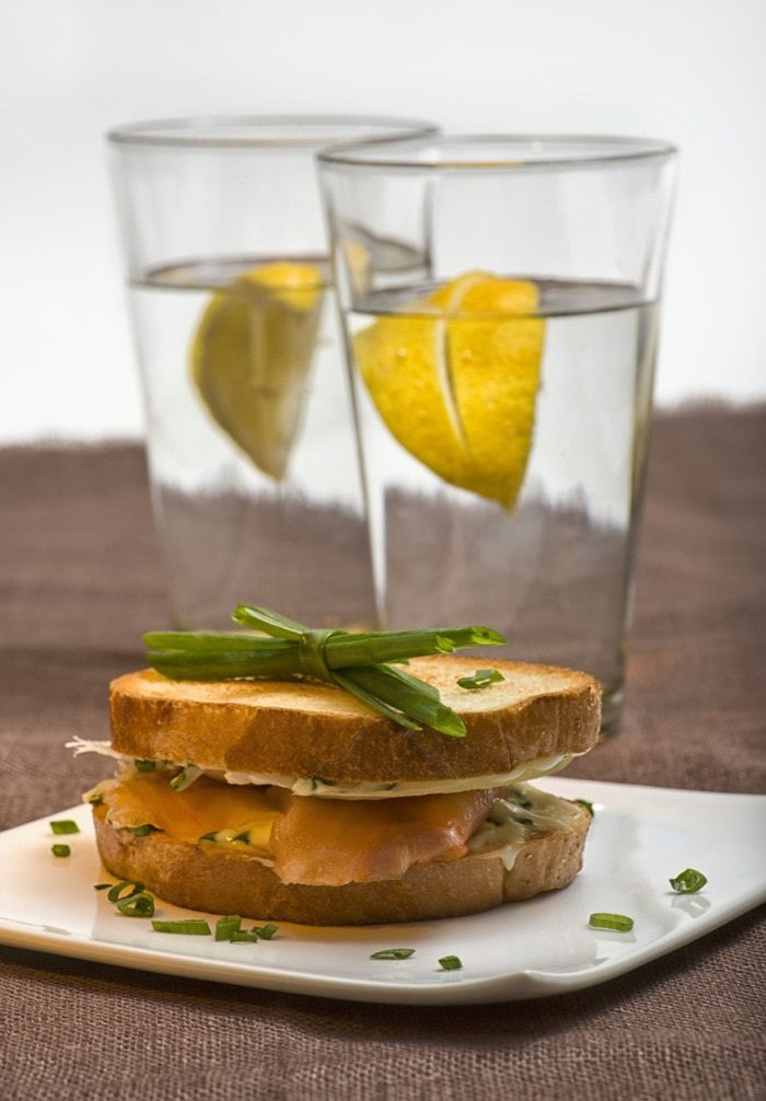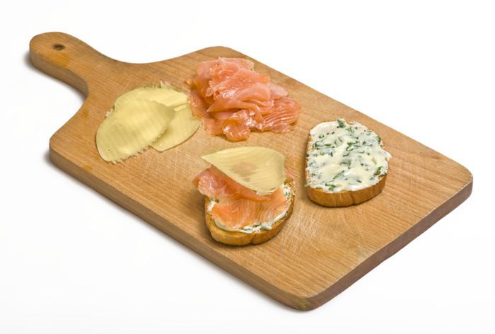 Ломтики хлеба смазать сырной смесью. На один из них сверху выложить лосось и тонкий ломтик пармезана, после накрыть вторым ломтиком хлеба, намазанной частью на сыр.