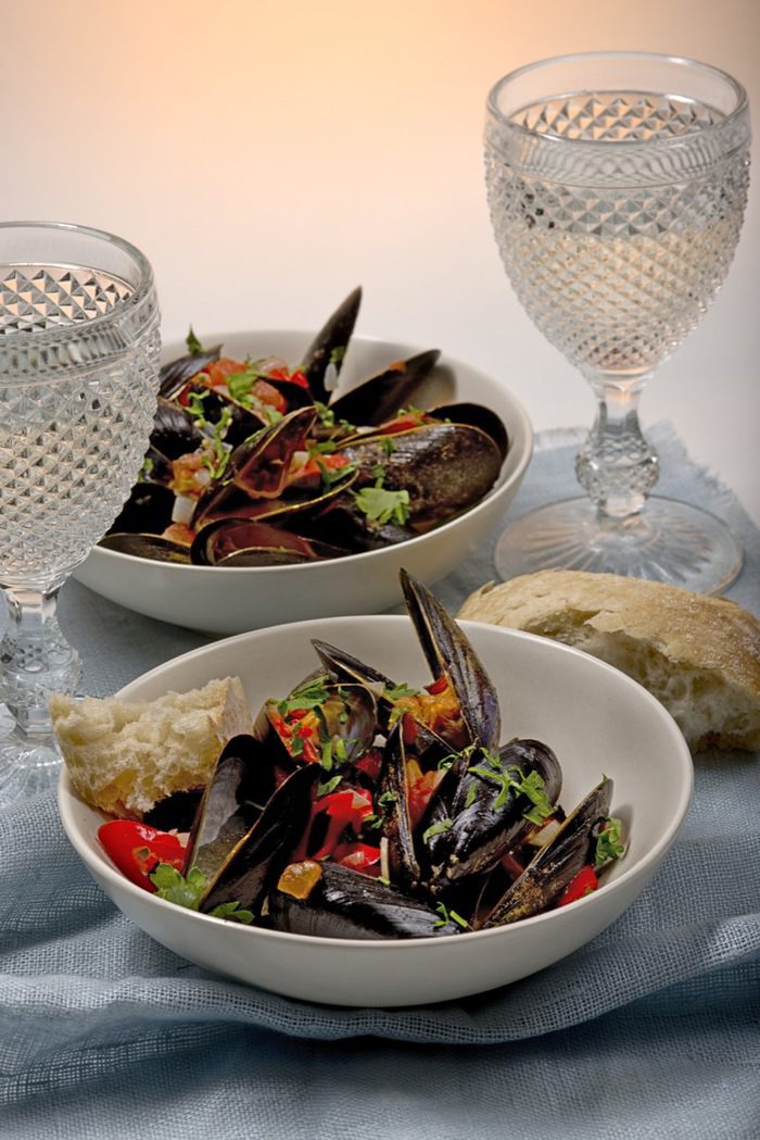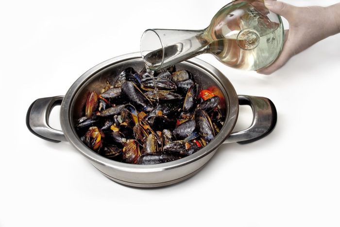 Затем положить мидии, влить вино, посолить, поперчить и закрыть крышкой. Готовить еще 10 минут. За минуту до окончания готовки добавить мелко порубленную петрушку.