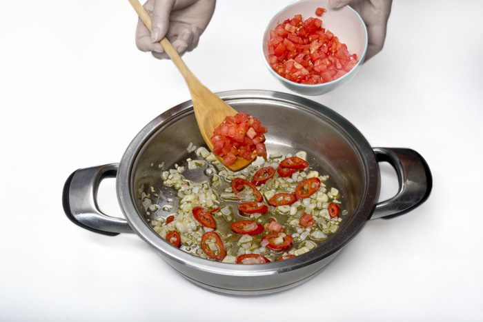 Помидоры полминуты бланшировать в кипящей воде, затем снять кожицу, мелко порезать, добавить к луку, чесноку и перцу чили. Тушить 10 минут.