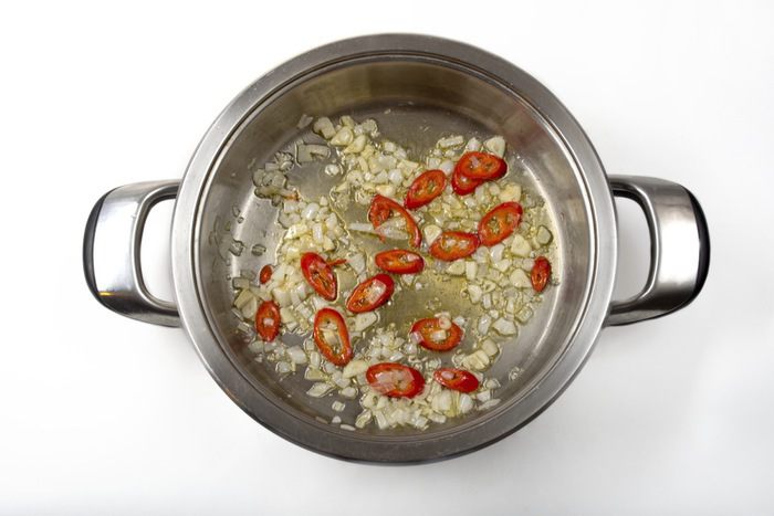 Лук, чеснок и перец чили обжарить на оливковом масле.