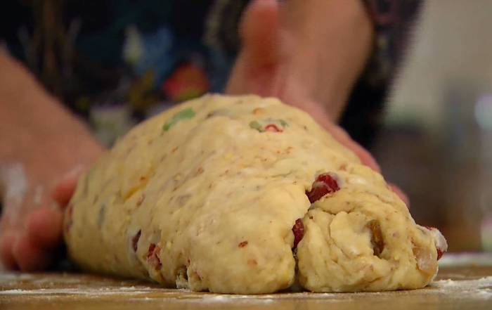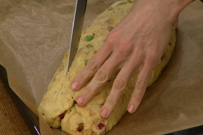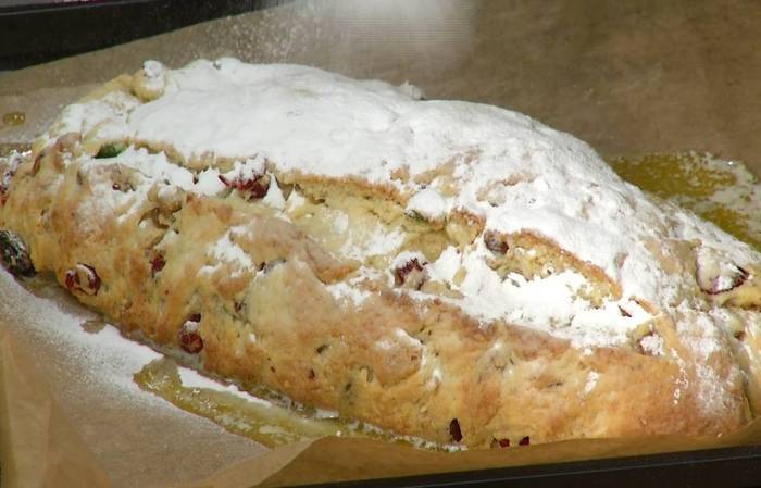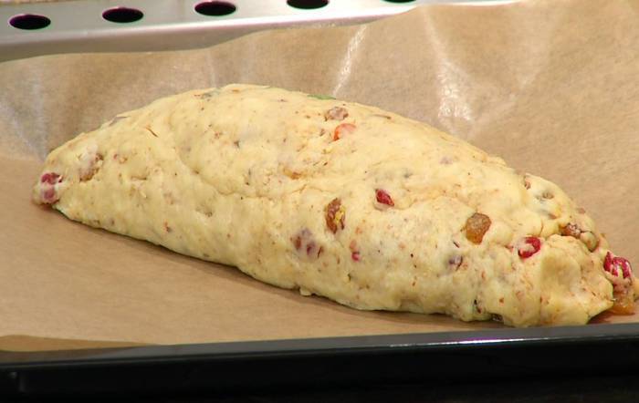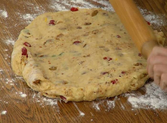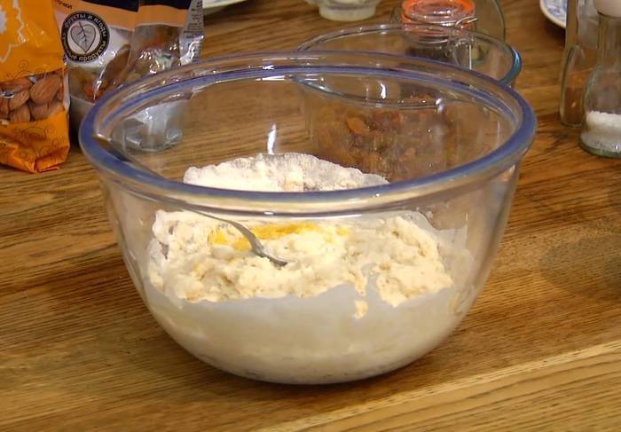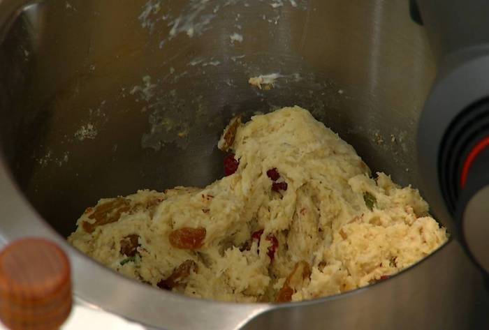В чашу комбайна всыпать оставшиеся 350 г муки, добавить 150 г предварительно размягченного сливочного масла и вымешать насадкой для теста. Не выключая комбайна, добавить яйца, сахар, кардамон и гвоздику, корицу, мускатный орех, ванильный сахар, соль и все вымешать.