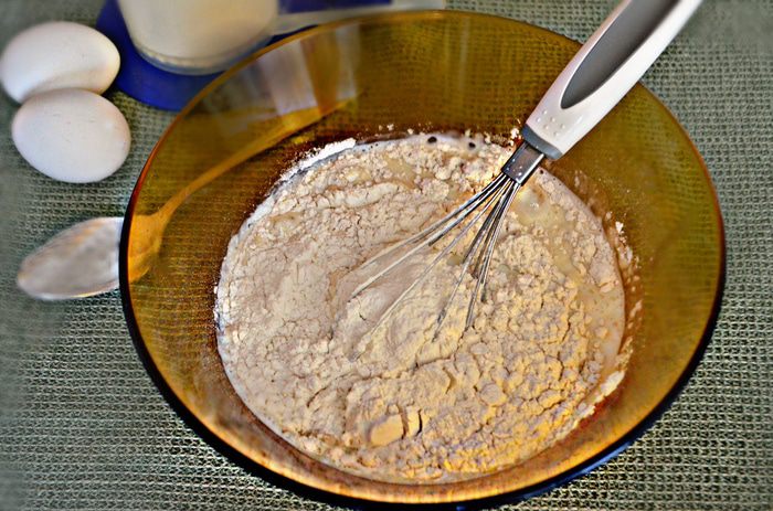 В тёплом молоке растворите дрожжи, сахар, добавьте 1/2 стакана муки и перемешайте. Накройте миску салфеткой и поставьте на 30-40 минут в тёплое место.