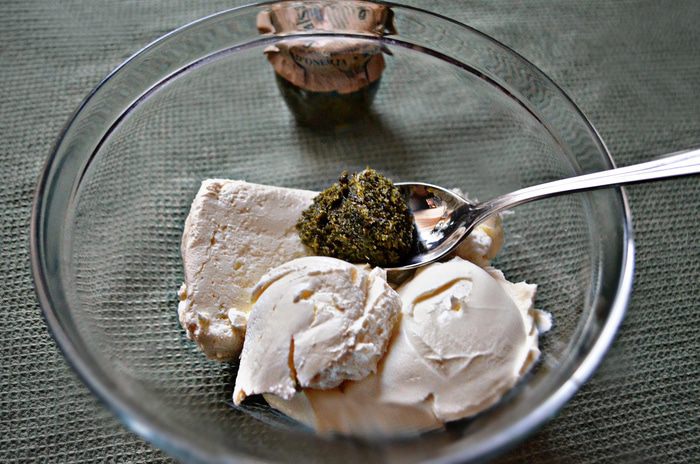 Для начинки творог смешайте с крем-сыром, сахаром, солью, перцем и соусом песто. Хорошо перемешайте.