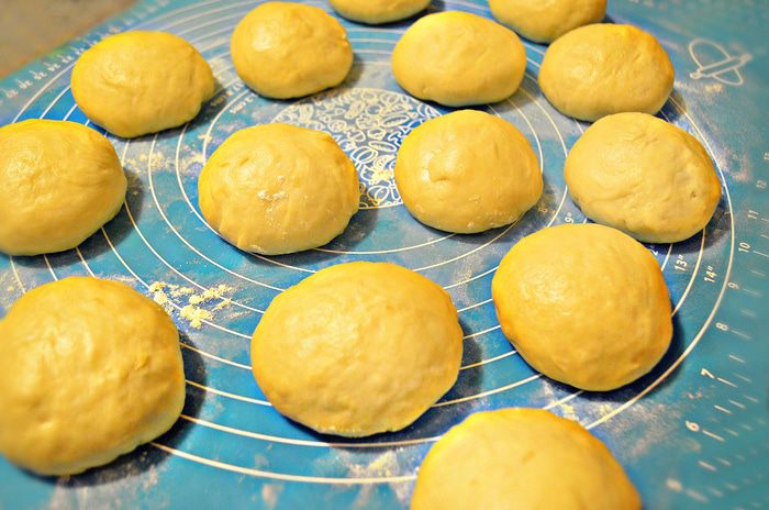 Готовое тесто разделите на небольшие кусочки, сформируйте шарики. Получилось 14 шт по 100 г. Можно сделать и по-меньше размером, тогда помидорок черри вам потребуется больше.