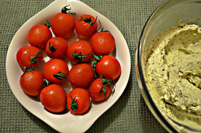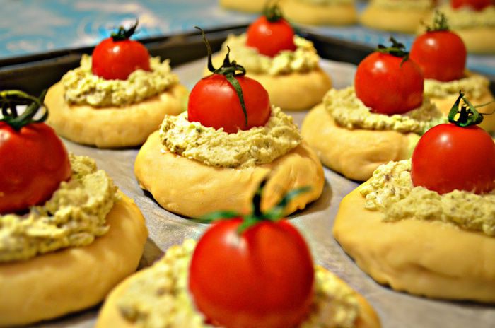 Помойте помидорки черри. У меня ушло 14 шт (300 г), по 1 шт на ватрушку.