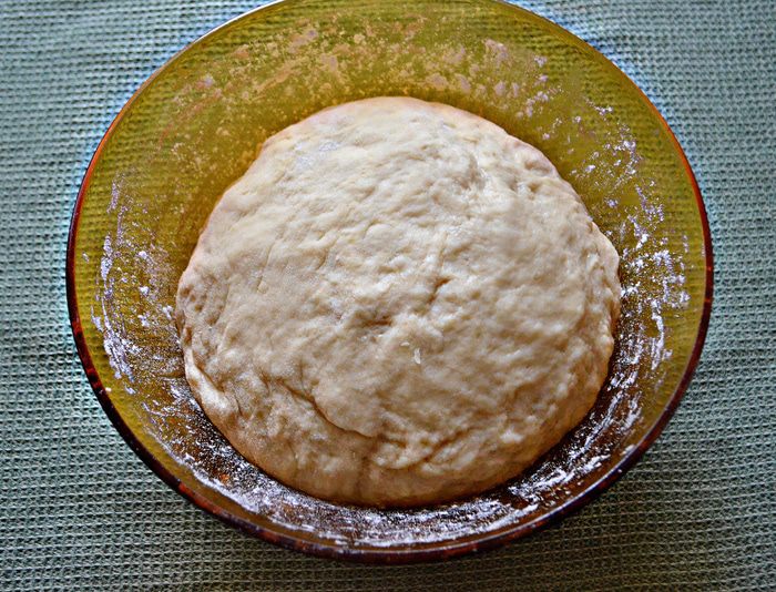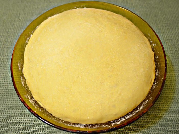 Накройте тесто полотенцем и поставьте на 30-40 минут в тёплое место. После этого слегка присыпьте мукой, затем обмять и дать подойти ещё раз.