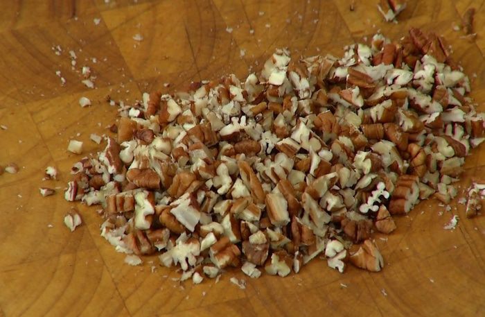 Орехи пекан порубить ножом, так чтобы получились небольшие кусочки.