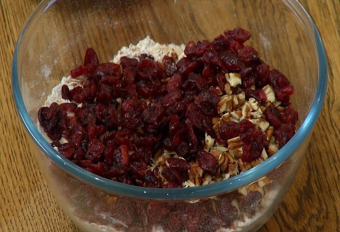 Геркулес перемешать с мукой, орехами, клюквой, ванильным сахаром, разрыхлителем и солью.