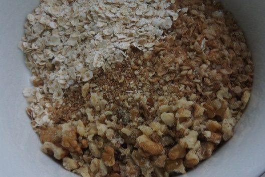 В миске смешать сухие ингредиенты: хлопья, отруби, орехи, кунжут все кроме изюма. Кунжут можно заменить на семечки.