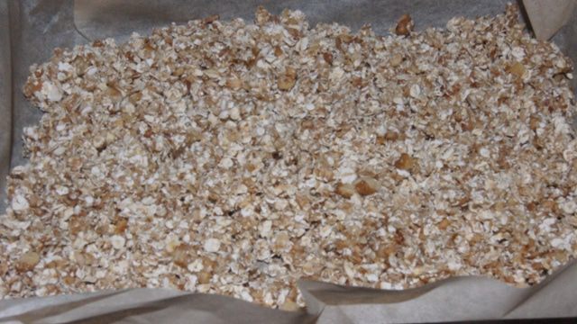 Залить сухую смесь, перемешать и высыпать на противень, застеленный бумагой для выпечки.