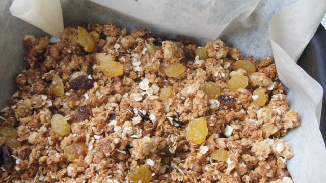 Запекать гранолу 20-25 минут до золотистого цвета. Один раз перемешать. Вот какая золотистая получается. Добавить изюм, перемешать и остудить.