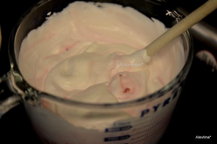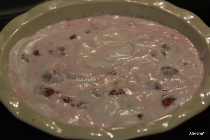 Добавить массу с малиной и перемешать осторожно.
