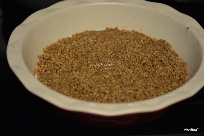 Смешать с растопленным маслом, сахаром и корицей. Выложить в приготовленную смазанную форму размером 20-22 см. Распределить аккуратно по дну. Поставить в горячую духовку на 5-8 минут. Дать остыть.