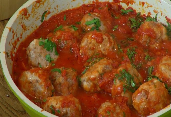 Подпеченные тефтели выложить в сковороду с соусом, добавить петрушку, все перемешать и тушить под крышкой почти до готовности.