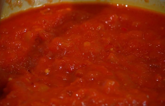 Приготовить соус: разогреть в сковороде оливковое масло, выложить лук, чеснок, чили и томатную пасту, перемешать и обжаривать все 3–4 минуты. Добавить помидоры, посолить, еще раз перемешать и прогревать на среднем огне, пока соус не загустеет.