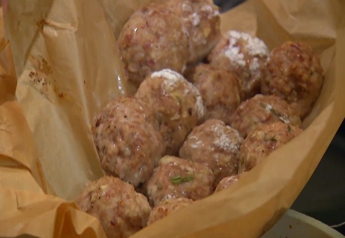 Небольшой глубокий противень для выпечки выстелить пищевой бумагой, выложить тефтели и отправить в морозильник на 5 минут.