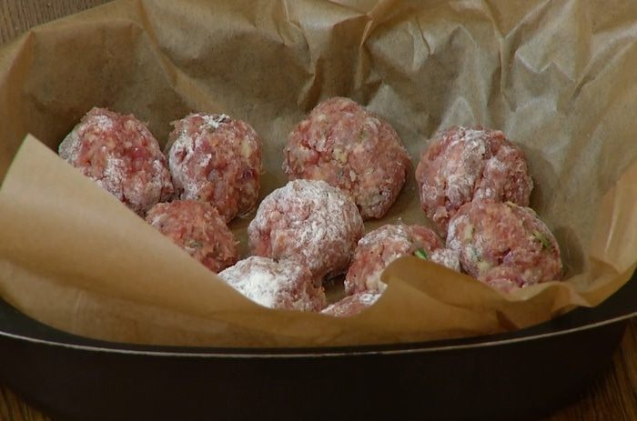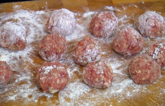 Сформировать из фарша шарики и обвалять со всех сторон в муке.