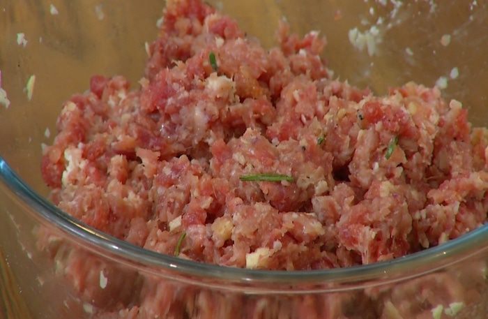 Приготовить фарш: к мясу с луком добавить замоченную булочку, яйцо, 1 ст. ложку натертого сыра, измельченный чеснок, листья тимьяна и розмарина, посолить, поперчить и перемешать.