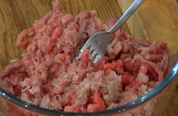 Свинину и говядину нарезать кусками и вместе с луком измельчить в мясорубке.