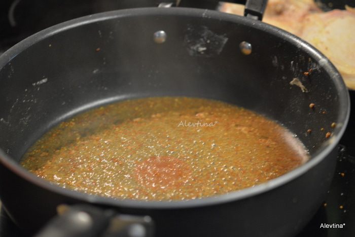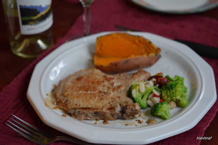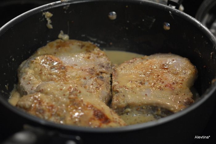 Добавить горчицу крупнозерновую, сливки и перемешать. Вернуть свиные отбивные. Раз перевернуть. Если жидкость у вас испарится добавить немного воды или бульона.