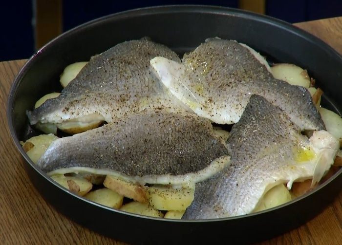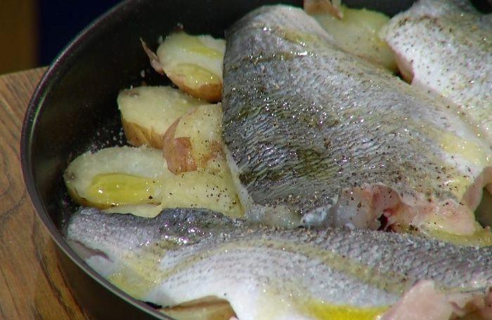 В форму для запекания влить пару ложек оливкового масла, выложить кружки картофеля, сверху поместить рыбу кожей вверх, сбрызнуть все оставшимся оливковым маслом, посолить и поперчить.