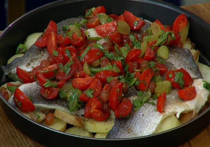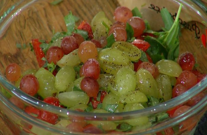 Приготовить соус: помидоры черри соединить с виноградом и тархуном, посолить, поперчить, влить 1 ч. ложку оливкового масла, уксус и все перемешать.