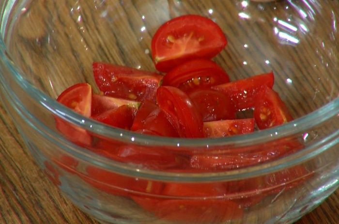 Помидоры черри разрезать на 4 части.