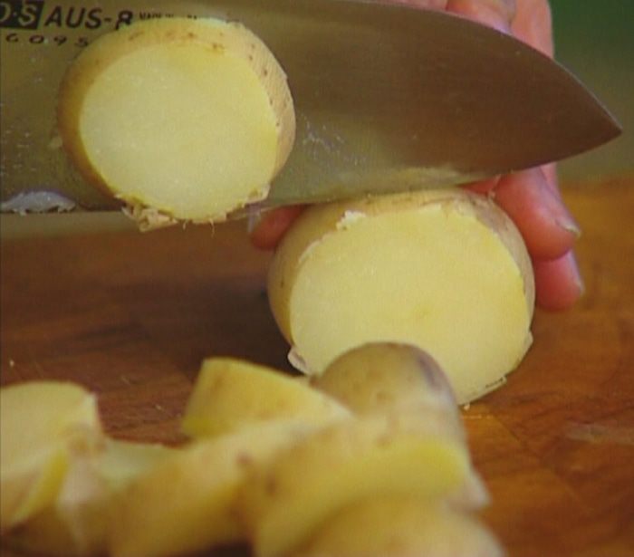 Картофель отварить в мундире, затем, не очищая, нарезать кружками.