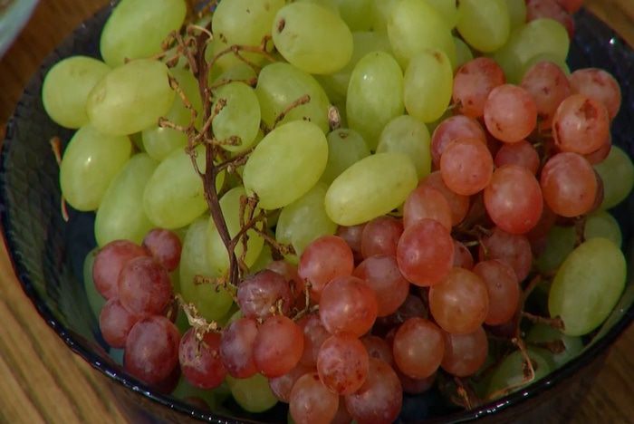 Крупные ягоды винограда разрезать пополам, маленькие оставить целыми.