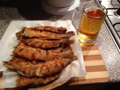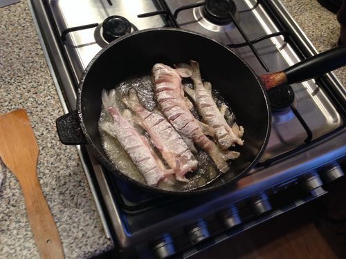 Свежепойманную щурогайку (именно свежую) обязательно чистим, потрошим, отрезаем голову – промываем, (да долго, да муторно — но конечный результат стоит того). Делаем надрезы по всей тушке, можно и не делать, но с надрезами мелкие косточки совсем не чувствуются после жарки. Слегка просушиваем (даем стечь воде). Бером сковородку, масло, готовим муку — (в одном из рецептов я уже это писал, но повторюсь, думаю, будет полезным). Я смесь делаю в прозрачном целлофановом мешочке (мусора меньше, тарелка не нужна, оставшаяся смесь дождется приготовления следующего блюда) мука+соль+перчик (у меня смесь трех перцев, очень ароматная). Разогреваем масло и по одной обваливаем готовые тушки в муке после выкладываем на сковородку.