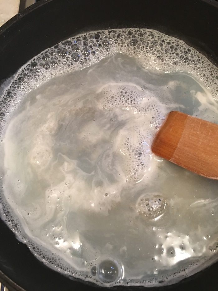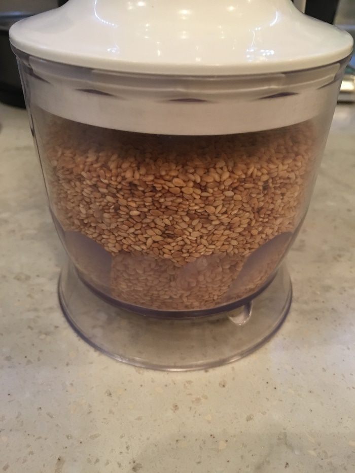 В той же сковороде обжариваем муку до легкого изменения цвета. К муке добавляем измельченный кунжут и еще раз всё смешиваем блендером.