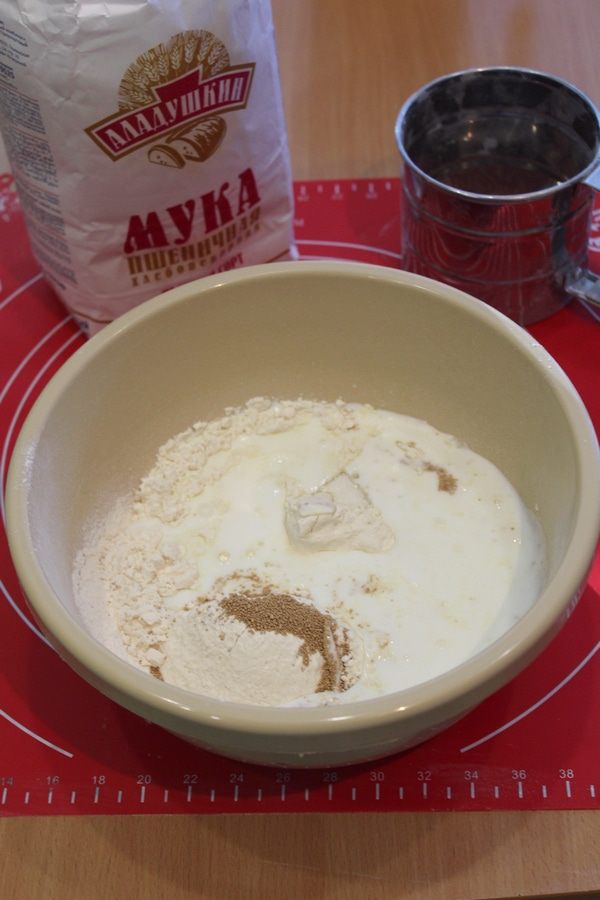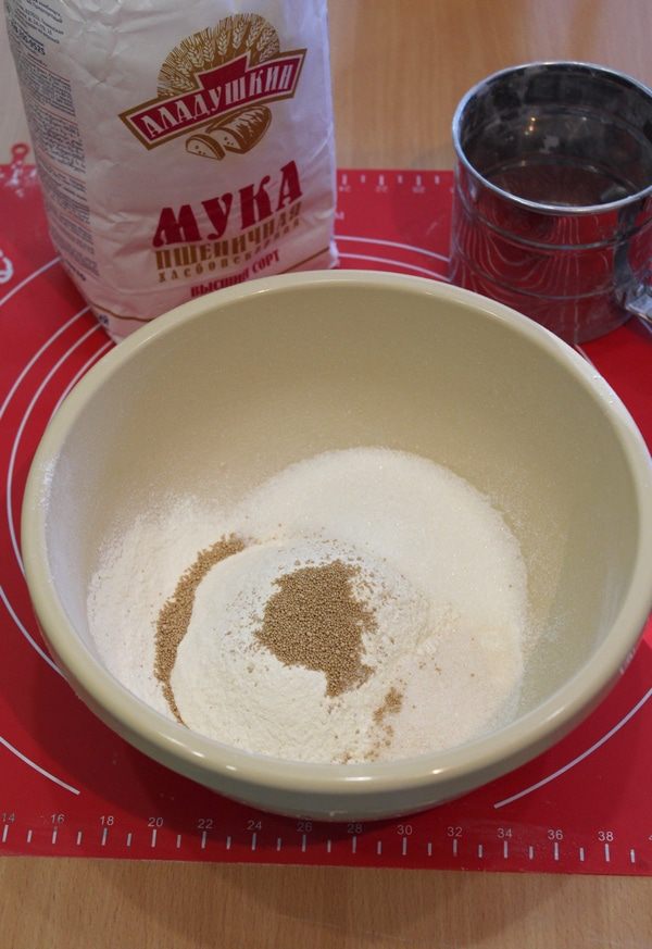 Просеять половину муки, добавить дрожжи, соль, сахар, ванильный сахар.