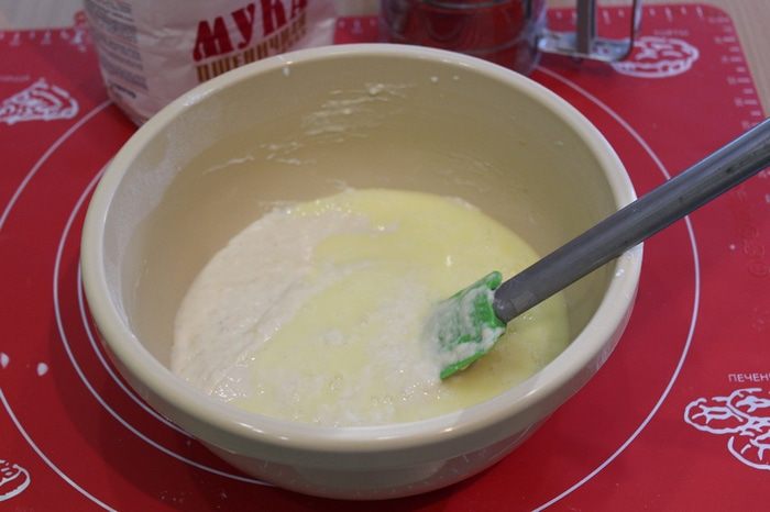 Затем теплый кефир тщательно размешать, чтобы дрожжи растворились, оставить минут на 5.