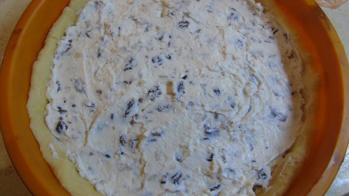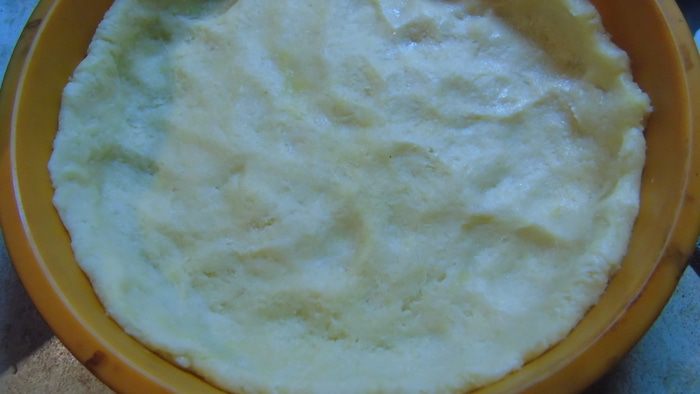 Тесто выложить в форму диаметром 22 см, нужно тонко раскатать и аккуратно выложить в форму, я же как всегда спешила, поэтому просто разровняла руками.