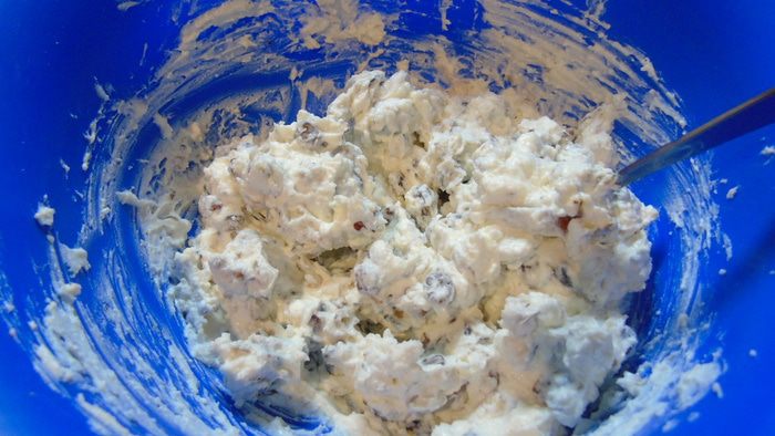 Рикотту смешать с вином, добавить сахар, крупно порезанный миндаль, розмарин и изюм, все хорошо перемешать.