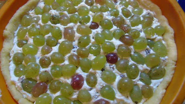 Сверху выкладываем виноград слегка его вдавливая в начинку. Отправляем в разогретую до 180-200С духовку на 25-35 минут, ориентируйтесь по своей духовке, пока тесто не станет золотистым.