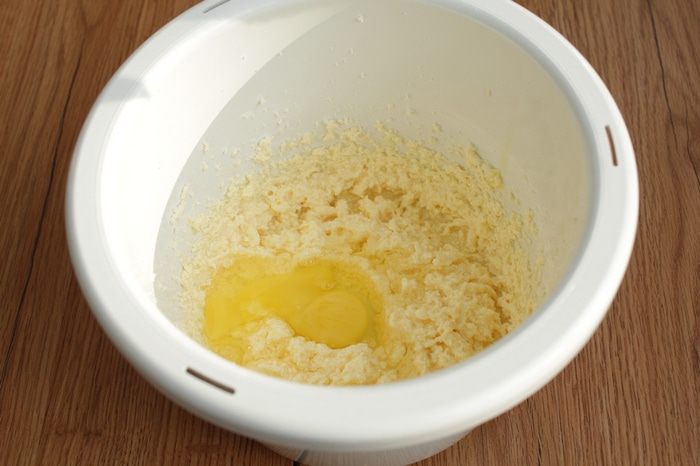 Взбить мягкое масло с сахаром до пышности. Добавьте по одному яйца, каждый раз тщательно взбивая.