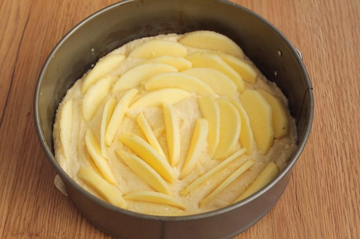 Тесто выложите в форму. Яблоки очистите, нарежьте тонкими дольками. Вдавите дольки в тесто.