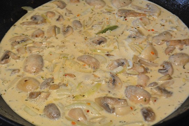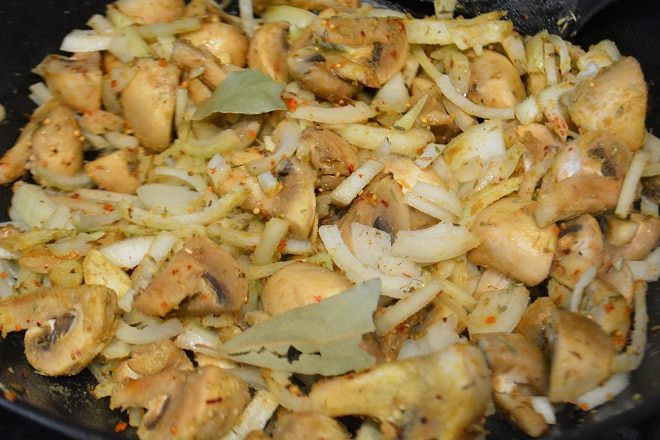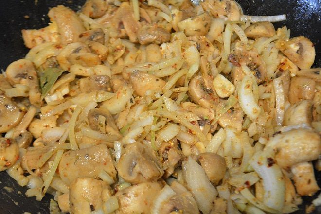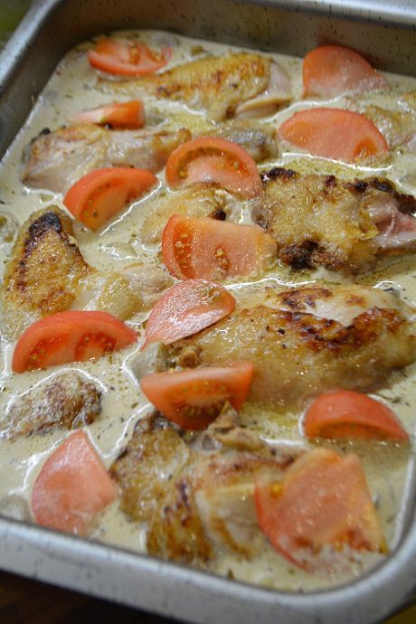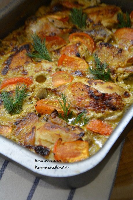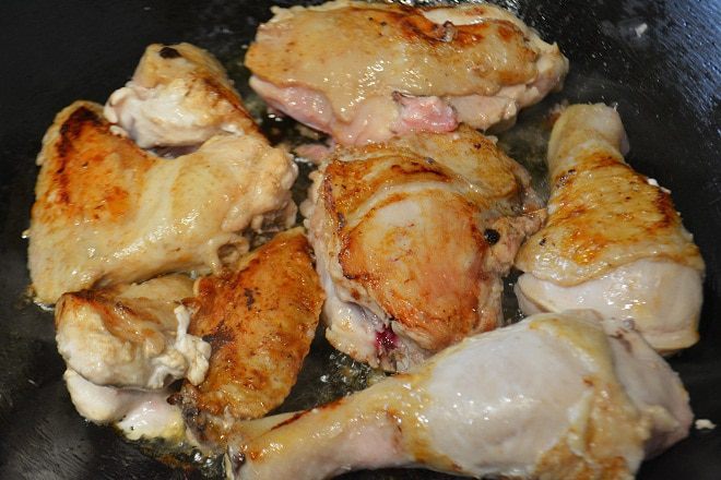 Курицу разрезать на порционные куски, помыть, просушить бумажным полотенцем. Сковороду разогреть, растопить сливочное масло и добавить к нему оливковое. Обжарить куски курицы с двух сторон до золотистой корочки. Переложить курицу в чашку, посолить немного и закрыть крышкой.