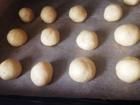 Сформировать из теста шарики, выложить на противень, застеленный пергаментом и выпекать 10-15 минут в разогретой до 200°С духовке, пока печенье не станет равномерно золотистым.