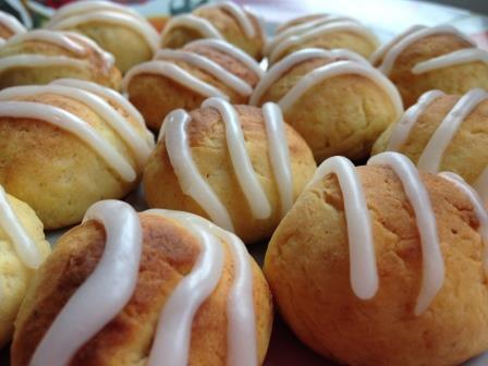 Для глазури к 2-м столовым ложкам сахарной пудры постепенно добавить примерно 1 чайную ложку лимонного сока (его может уйти чуть больше или чуть меньше). Глазурь не должна получиться жидкой - она должна быть густой, но тягучей.